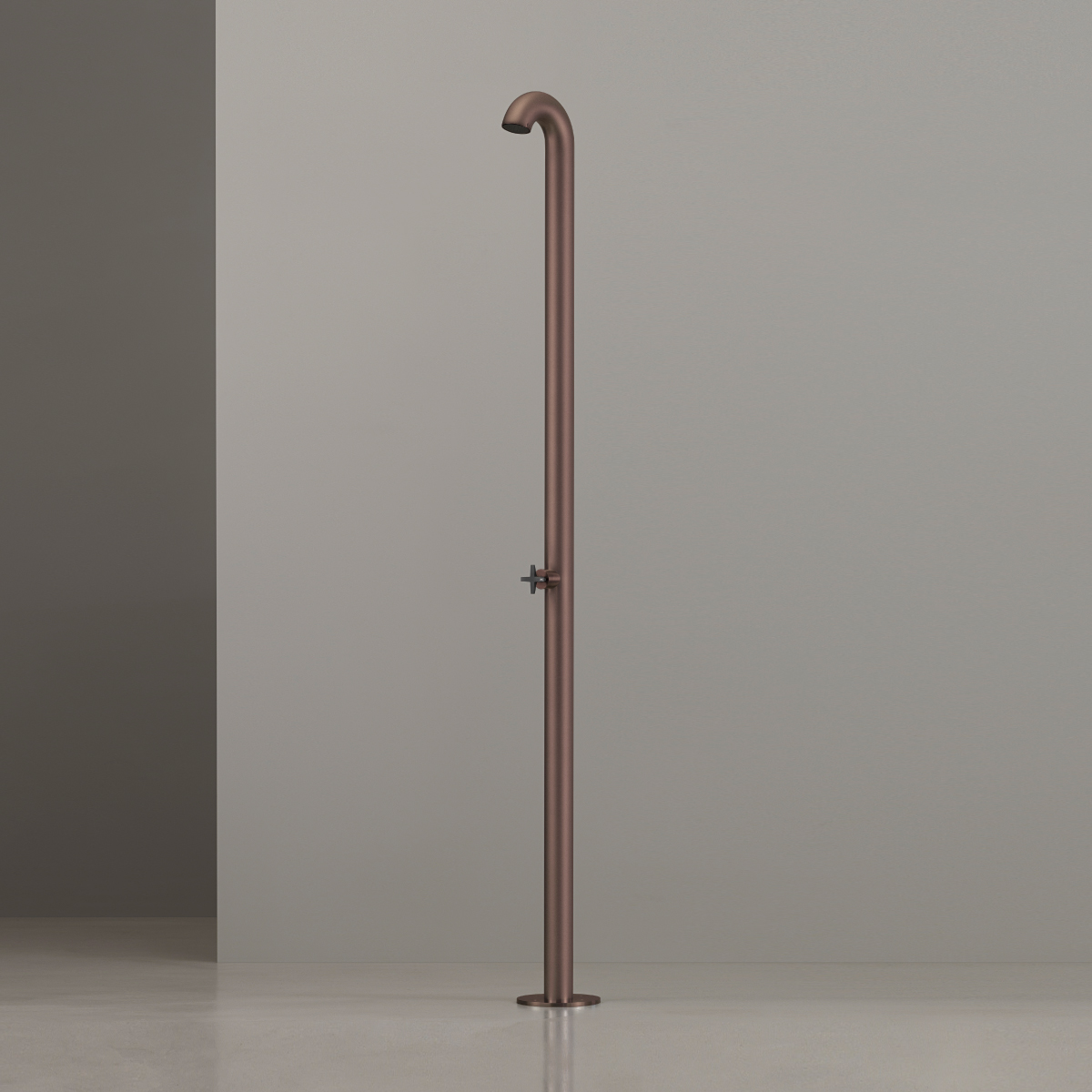Ελεύθερο υπαίθριο ντους από ανοξείδωτο χάλυβα AISI 316L, φινίρισμα Corten. Αεριζόμενος πίδακας βροχής ελεγχόμενος από προοδευτικό αναμικτήρα της συλλογής CROSS σε ματ φινίρισμα Black Diamond.