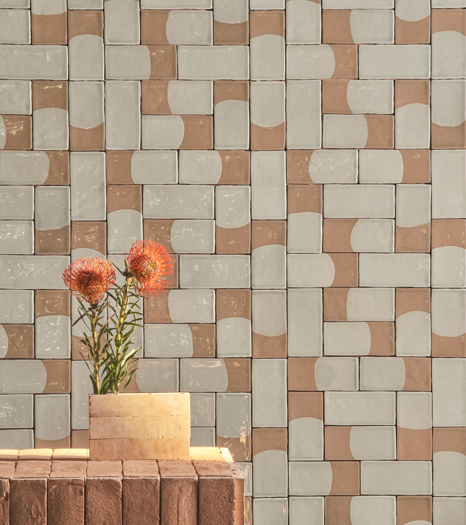 The brushstrokes, all the same, and at the same time different, compose a pattern in which the dexterity of the pictorial gesture connotes the identity of each individual tile, celebrating the movement that animates the plant world beneath the surface of the water. The manual intervention here becomes accurate precision, the geometry sharply traced and the color densely brushed. The cladding composes a natural and organic mosaic, playing with tone on tone within an overlapping and layered texture, working on an earthy-inspired warp evoking the outline of river waters.