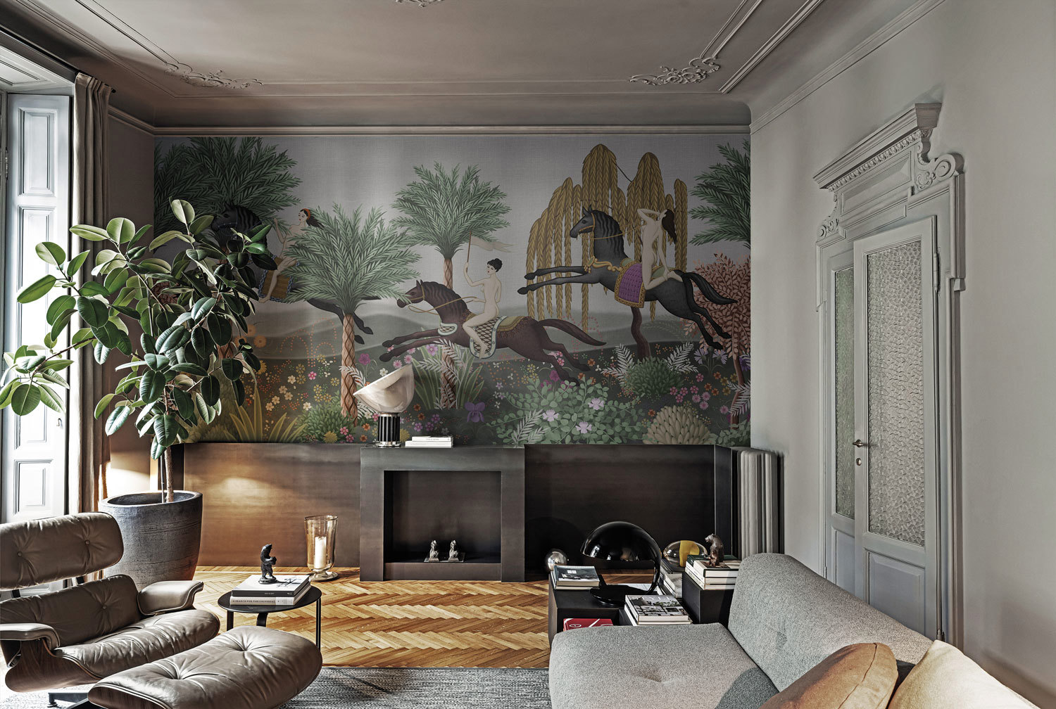 “The Thousand and One Nights” is a book that no one can claim to have ever read in its entirety because it never actually existed; in fact, it is composed of infinite books, each one different from the other, intertwined, mixed, and blended together: a tangle of ancient stories. It is perhaps the most famous fairy tale in the world, which remained in the shadows for a long time until Monsieur Antoine Galland, in Paris in 1704, was the first to translate, transcribe, and publish the collection. Londonart, for the second chapter of the Tale Books Collection, continues its narrative, starting precisely from “The Thousand and One Nights” and creating a sensory scenario in which one can almost smell the spices and hear the noise of the markets, amidst palm trees, jewels, carpets, horses, turbans, and veils. It all started from an idea by Pj Natuzzi, who was looking for something that could fully represent him for his new home project; the aim was to tell a story within a story. Fascinated by the Oriental tale that represents a fusion of different worlds, Pj, thanks to the collaboration of Nicola Bottegal and the Londonart team, managed to merge the Arab world with a new Mediterranean perspective that celebrates Puglia. The result is a collection of 15 subjects that embellish the spaces they inhabit, telling stories of love and friendship, vices and virtues, courage and loyalty, populated by sultans, love-stricken princes, voluptuous queens, cunning servants, and animals - glimpses of life that this world encompasses. The pleasure of storytelling is found in every wallpaper, where imagination takes centre stage, having the power to save us and stop time for more than a thousand and one nights.