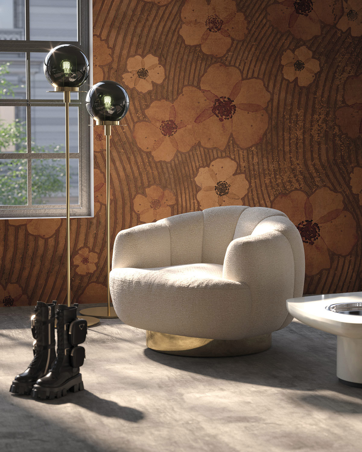 All wallpapers of The Daydreamer capsule collection are embellished by seductive textures, capable of creating a three-dimensional illusion and stimulating a new perception of space. Greatly impactful backgrounds, where the macro decoration takes the spotlight to transform the living spaces into theatrical wings, with precious decorations, waves of colour, intoxicating flowers, and patterns reminiscent of precious fabrics.