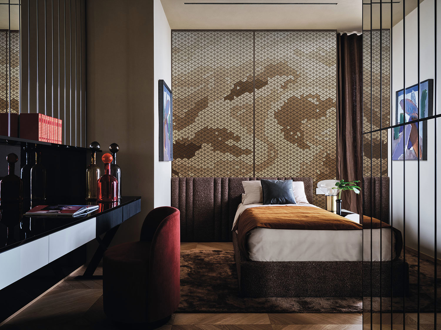 A path that emphasizes the eclecticism and universal nature of taste; an itinerary that crosses Europe, Asia, and Africa, leaving indelible traces in the graphics that can be seen within the collection. The search for extreme depth in the composition is able to develop over large surfaces by skilfully mixing blush, burnt, rusty tones, macro geometry, lace, tarot cards, and botanical elements. The result is an almost primordial elegance, reinterpreted through the colours of the earth with tribal accents, in which each subject is embellished and sophisticated. The graphics become a substantial element of the architectural project; a story to dress the environments and make them evocative.