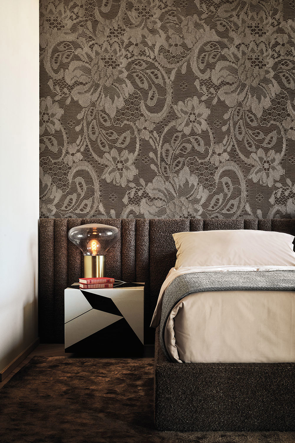 A path that emphasizes the eclecticism and universal nature of taste; an itinerary that crosses Europe, Asia, and Africa, leaving indelible traces in the graphics that can be seen within the collection. The search for extreme depth in the composition is able to develop over large surfaces by skilfully mixing blush, burnt, rusty tones, macro geometry, lace, tarot cards, and botanical elements. The result is an almost primordial elegance, reinterpreted through the colours of the earth with tribal accents, in which each subject is embellished and sophisticated. The graphics become a substantial element of the architectural project; a story to dress the environments and make them evocative.