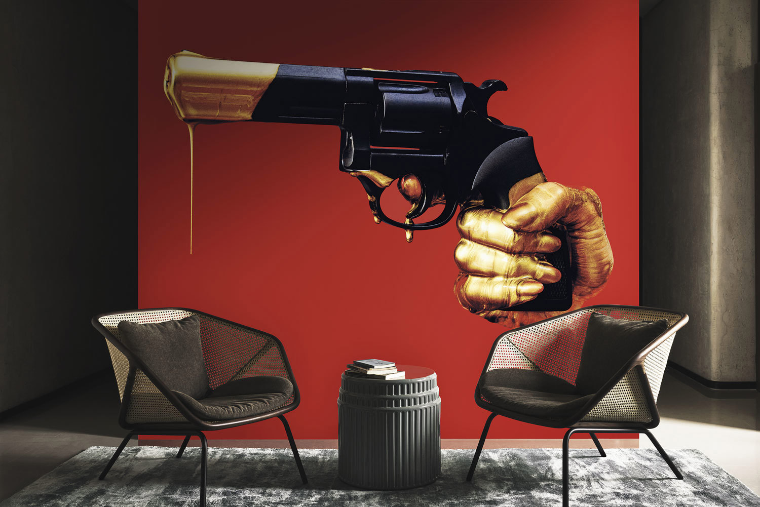 Londonart’s LUXURY SHIT Collection is the first wallpaper capsule designed by TOILETPAPER and contains the iconic subjects and the best sellers of the pictures taken by Maurizio Cattelan and Pierpaolo Ferrari. Born from the collaboration between the contemporary artist and the photographer, TOILETPAPER is a magazine made up entirely of images created by the two artists with the idea of creating a new concept between artistic language and advertising language, art and fashion. Vibrant, provocative, and irreverent images that combine the layer of commercial photography with pop suggestions, surrealist evocations, sexual obsessions, ambiguities, creating complex orchestrations that ironize showing a new exploration of the world of art. Each image comes from an intuition, even a simple one, to then become a complex composition of ideas, people, and objects that build a sort of mental outlet. The multiplicity of creativity of the designers and a vision in constant ferment has made TOILETPAPER a true brand with a precise and recognizable identity. LUXURY SHIT for Londonart is not only a selection of beautiful images, but a story that connects different subjects to bring out a complete vision of TOILETPAPER’s visual nonconformity. Each wallpaper has an immediate impact, so as not to get lost among all the others; the colour and the situation keep the spectator glued to it. A sequence that embraces everything, an inspiration that draws from different hemispheres of creativity, from everything that surrounds us and that deserves a new look, an unexpected point of view. So a rain of popcorn, a sea of spaghetti and crisps, pierced macro flowers, mirrors that reflect the sky, giant mouths, a gun that drips gold, become decor, because everything in the TOILETPAPER world becomes possible and real, daily and concrete in its absurdity. The wallpapers of LUXURY SHIT adapt to any environment, accentuating the pop and democratic tone of contemporary environments, or, in perfect contrast, taking the edge off the classic and extra-luxury environments
