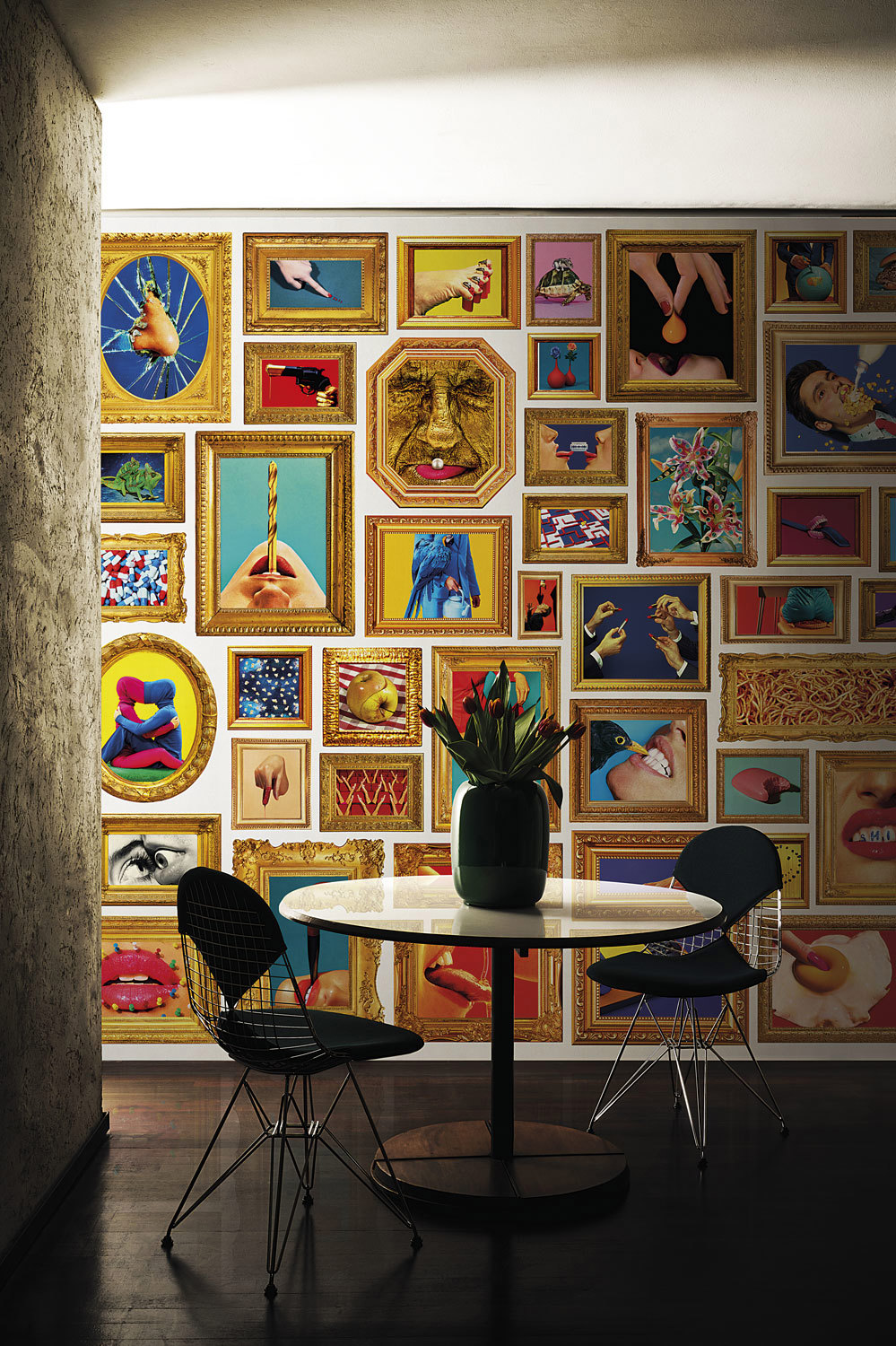 Londonart’s LUXURY SHIT Collection is the first wallpaper capsule designed by TOILETPAPER and contains the iconic subjects and the best sellers of the pictures taken by Maurizio Cattelan and Pierpaolo Ferrari. Born from the collaboration between the contemporary artist and the photographer, TOILETPAPER is a magazine made up entirely of images created by the two artists with the idea of creating a new concept between artistic language and advertising language, art and fashion. Vibrant, provocative, and irreverent images that combine the layer of commercial photography with pop suggestions, surrealist evocations, sexual obsessions, ambiguities, creating complex orchestrations that ironize showing a new exploration of the world of art. Each image comes from an intuition, even a simple one, to then become a complex composition of ideas, people, and objects that build a sort of mental outlet. The multiplicity of creativity of the designers and a vision in constant ferment has made TOILETPAPER a true brand with a precise and recognizable identity. LUXURY SHIT for Londonart is not only a selection of beautiful images, but a story that connects different subjects to bring out a complete vision of TOILETPAPER’s visual nonconformity. Each wallpaper has an immediate impact, so as not to get lost among all the others; the colour and the situation keep the spectator glued to it. A sequence that embraces everything, an inspiration that draws from different hemispheres of creativity, from everything that surrounds us and that deserves a new look, an unexpected point of view. So a rain of popcorn, a sea of spaghetti and crisps, pierced macro flowers, mirrors that reflect the sky, giant mouths, a gun that drips gold, become decor, because everything in the TOILETPAPER world becomes possible and real, daily and concrete in its absurdity. The wallpapers of LUXURY SHIT adapt to any environment, accentuating the pop and democratic tone of contemporary environments, or, in perfect contrast, taking the edge off the classic and extra-luxury environments