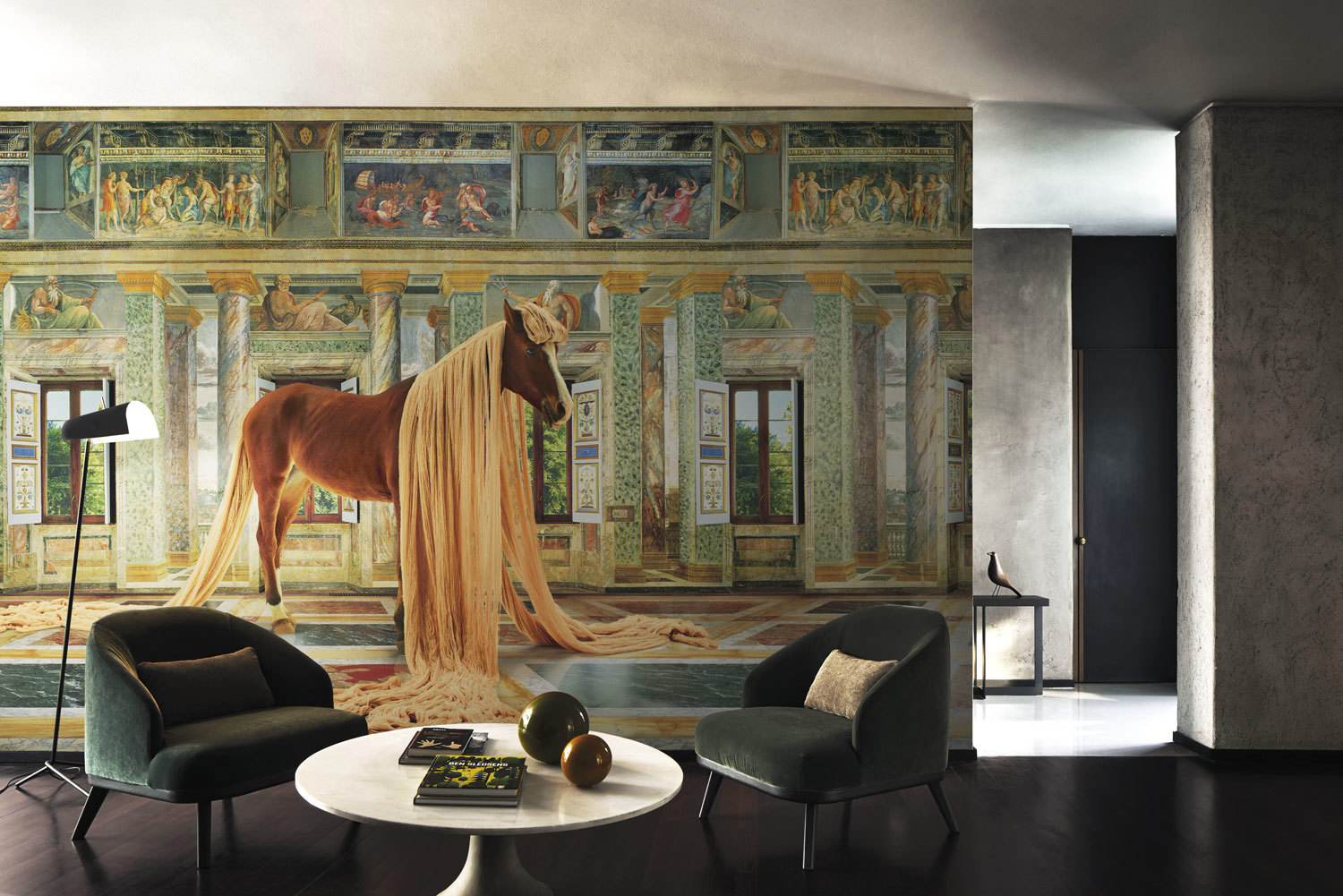 Londonart’s LUXURY SHIT Collection is the first wallpaper capsule designed by TOILETPAPER and contains the iconic subjects and the best sellers of the pictures taken by Maurizio Cattelan and Pierpaolo Ferrari. Born from the collaboration between the contemporary artist and the photographer, TOILETPAPER is a magazine made up entirely of images created by the two artists with the idea of creating a new concept between artistic language and advertising language, art and fashion. Vibrant, provocative, and irreverent images that combine the layer of commercial photography with pop suggestions, surrealist evocations, sexual obsessions, ambiguities, creating complex orchestrations that ironize showing a new exploration of the world of art. Each image comes from an intuition, even a simple one, to then become a complex composition of ideas, people, and objects that build a sort of mental outlet. The multiplicity of creativity of the designers and a vision in constant ferment has made TOILETPAPER a true brand with a precise and recognizable identity. LUXURY SHIT for Londonart is not only a selection of beautiful images, but a story that connects different subjects to bring out a complete vision of TOILETPAPER’s visual nonconformity. Each wallpaper has an immediate impact, so as not to get lost among all the others; the colour and the situation keep the spectator glued to it. A sequence that embraces everything, an inspiration that draws from different hemispheres of creativity, from everything that surrounds us and that deserves a new look, an unexpected point of view. So a rain of popcorn, a sea of spaghetti and crisps, pierced macro flowers, mirrors that reflect the sky, giant mouths, a gun that drips gold, become decor, because everything in the TOILETPAPER world becomes possible and real, daily and concrete in its absurdity. The wallpapers of LUXURY SHIT adapt to any environment, accentuating the pop and democratic tone of contemporary environments, or, in perfect contrast, taking the edge off the classic and extra-luxury environments