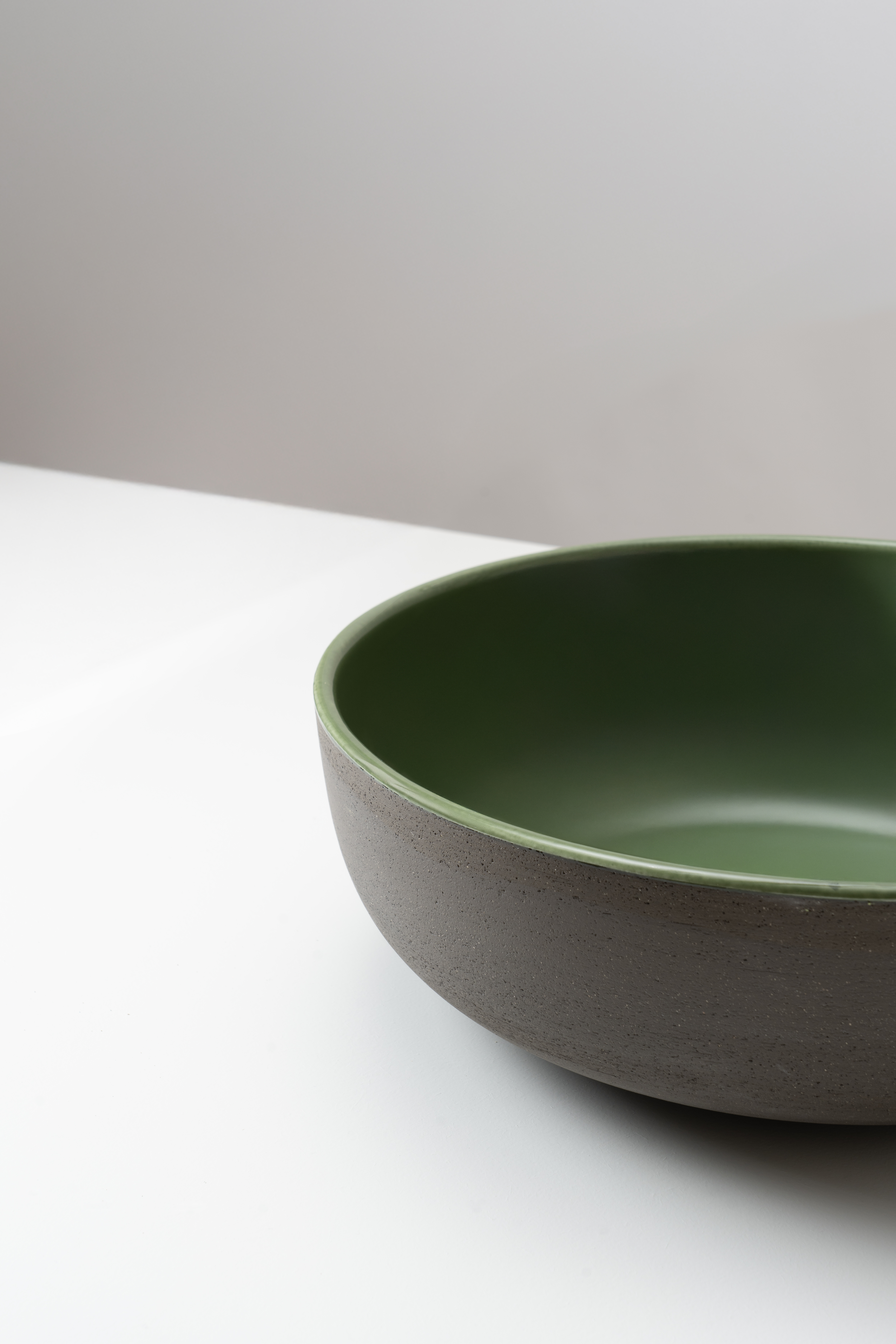 Countertop washbasin in dark Raku. Flared shape and glassy glazes that contrasting with the texture almost sanded down.
