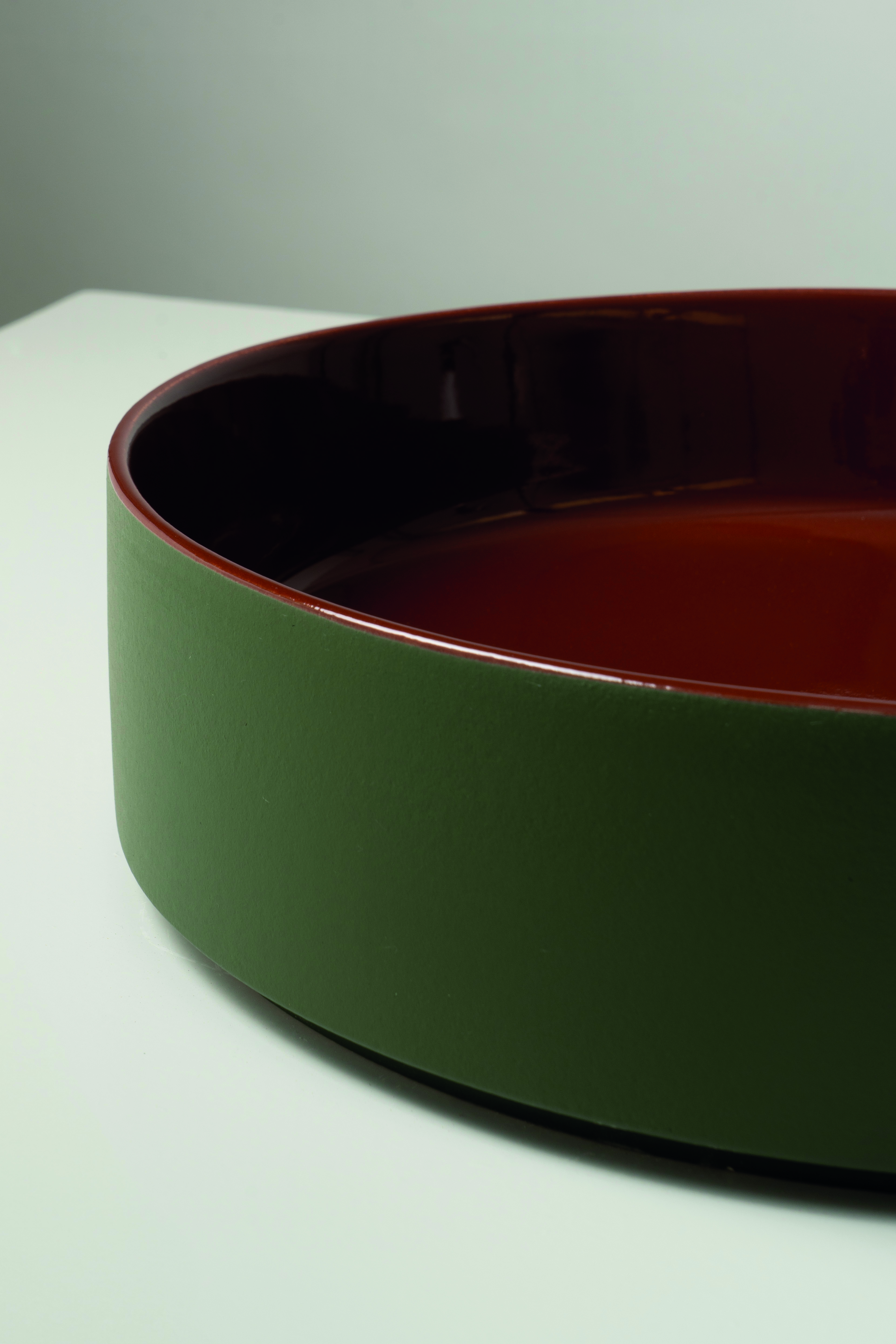 Glossy mattone on the inside, materic salvia on the outside.