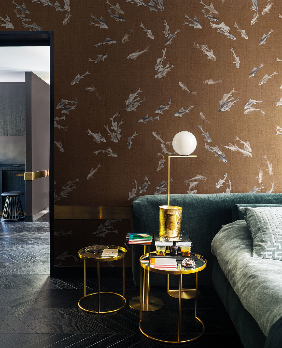 Little carp, which in the Eastern tradition mainly symbolize perseverance and courage, enliven this elegant wallpaper with a strong decorative impact.