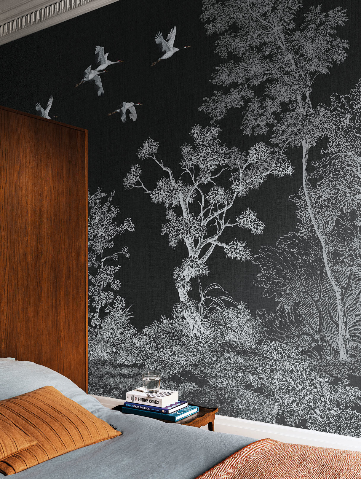 A landscape with trees and a flight of cranes, a simple composition characterized by voids interrupted by minimal lines with faint colours; nature, which has fascinated the artistic sensibility of the Japanese throughout history, is still the protagonist.