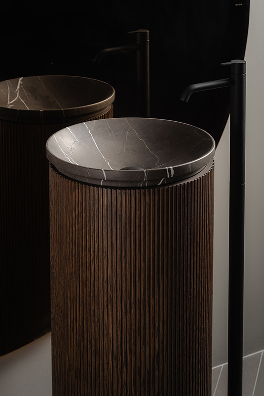 Freestanding washbasin from Grate collection. Washbasin available in matt solidsurface, UHS colour coating (60 colours) or marble. Column available in wild oak S3.