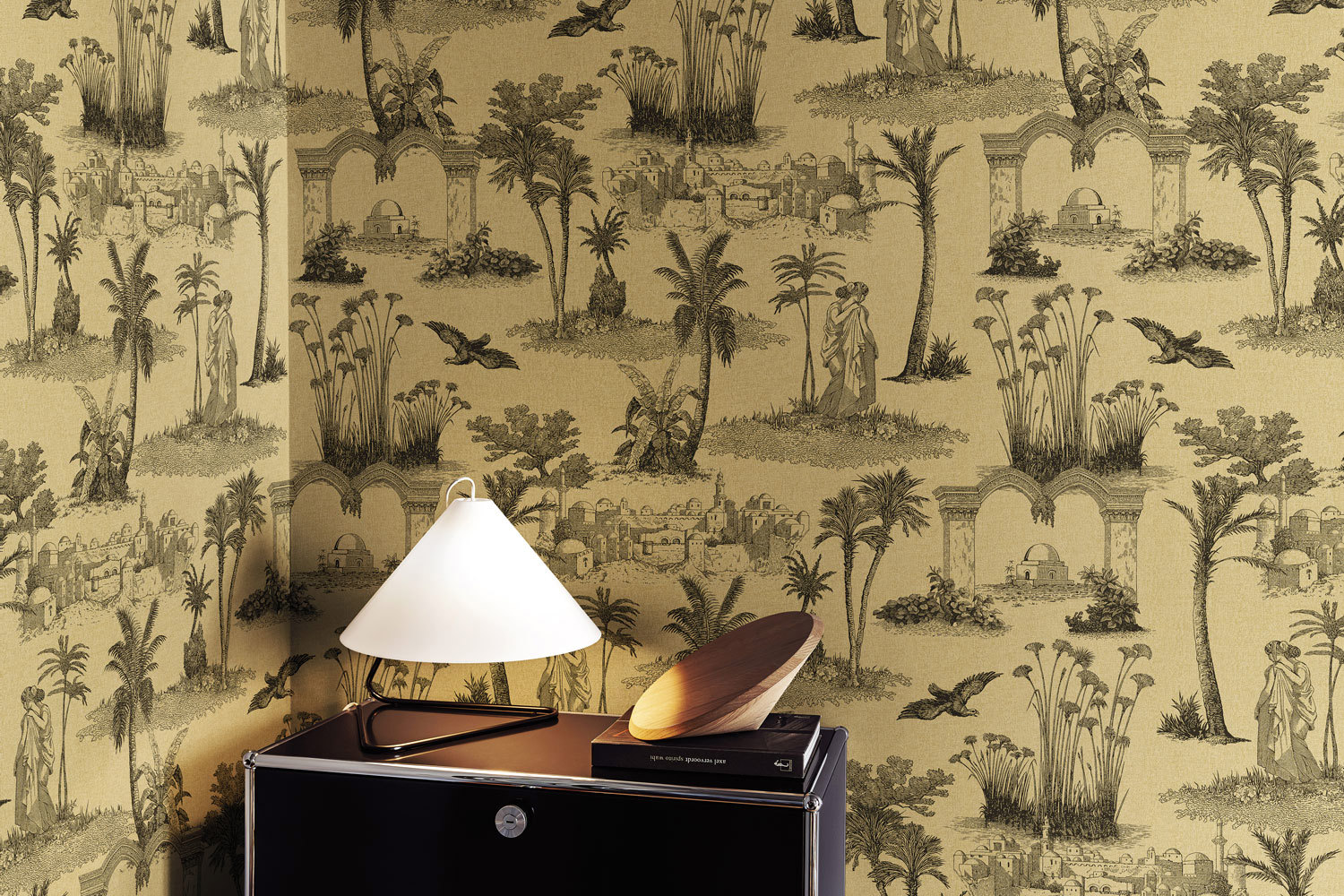 “The Thousand and One Nights” is a book that no one can claim to have ever read in its entirety because it never actually existed; in fact, it is composed of infinite books, each one different from the other, intertwined, mixed, and blended together: a tangle of ancient stories. It is perhaps the most famous fairy tale in the world, which remained in the shadows for a long time until Monsieur Antoine Galland, in Paris in 1704, was the first to translate, transcribe, and publish the collection. Londonart, for the second chapter of the Tale Books Collection, continues its narrative, starting precisely from “The Thousand and One Nights” and creating a sensory scenario in which one can almost smell the spices and hear the noise of the markets, amidst palm trees, jewels, carpets, horses, turbans, and veils. It all started from an idea by Pj Natuzzi, who was looking for something that could fully represent him for his new home project; the aim was to tell a story within a story. Fascinated by the Oriental tale that represents a fusion of different worlds, Pj, thanks to the collaboration of Nicola Bottegal and the Londonart team, managed to merge the Arab world with a new Mediterranean perspective that celebrates Puglia. The result is a collection of 15 subjects that embellish the spaces they inhabit, telling stories of love and friendship, vices and virtues, courage and loyalty, populated by sultans, love-stricken princes, voluptuous queens, cunning servants, and animals - glimpses of life that this world encompasses. The pleasure of storytelling is found in every wallpaper, where imagination takes centre stage, having the power to save us and stop time for more than a thousand and one nights.