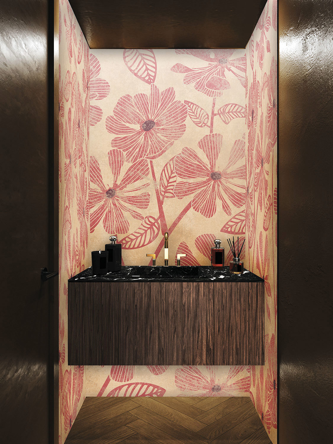 All wallpapers of The Daydreamer capsule collection are embellished by seductive textures, capable of creating a three-dimensional illusion and stimulating a new perception of space. Greatly impactful backgrounds, where the macro decoration takes the spotlight to transform the living spaces into theatrical wings, with precious decorations, waves of colour, intoxicating flowers, and patterns reminiscent of precious fabrics.