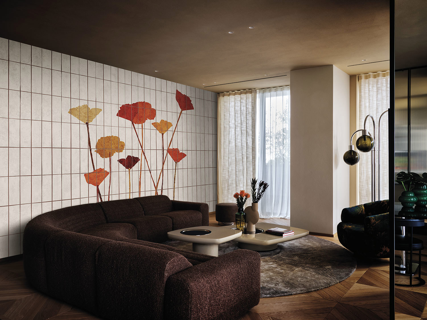 A path that emphasizes the eclecticism and universal nature of taste; an itinerary that crosses Europe, Asia, and Africa, leaving indelible traces in the graphics that can be seen within the collection. The search for extreme depth in the composition is able to develop over large surfaces by skilfully mixing blush, burnt, rusty tones, macro geometry, lace, tarot cards, and botanical elements. The result is an almost primordial elegance, reinterpreted through the colours of the earth with tribal accents, in which each subject is embellished and sophisticated. The graphics become a substantial element of the architectural project; a story to dress the environments and make them evocative.