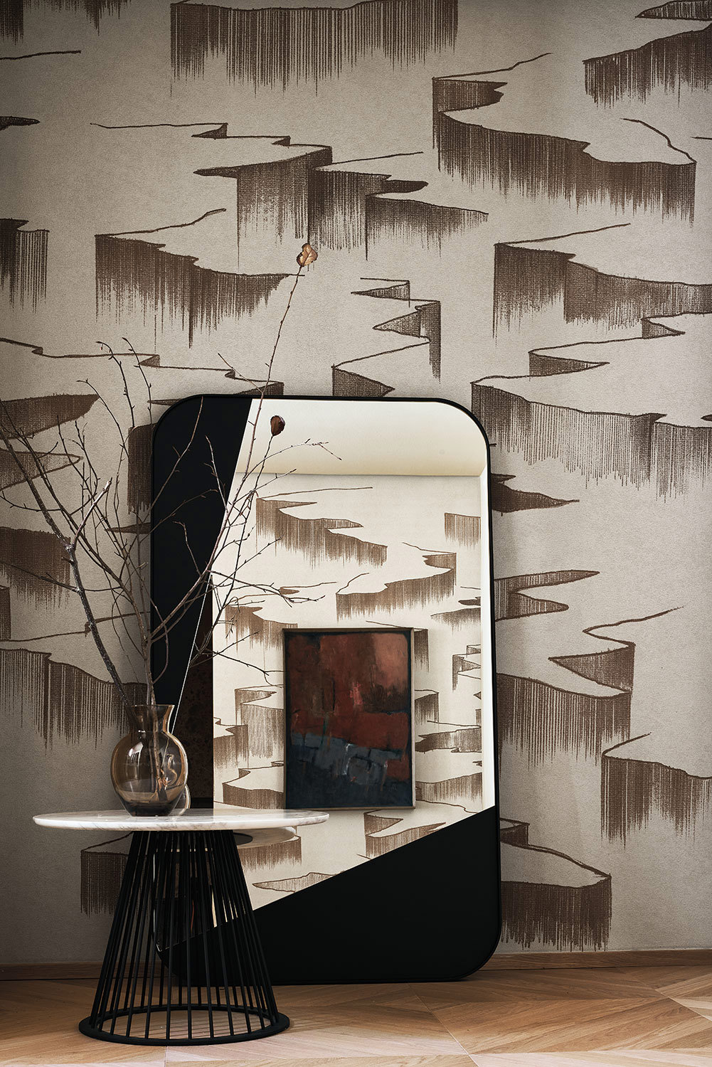 A path that emphasizes the eclecticism and universal nature of taste; an itinerary that crosses Europe, Asia, and Africa, leaving indelible traces in the graphics that can be seen within the collection. The search for extreme depth in the composition is able to develop over large surfaces by skilfully mixing blush, burnt, rusty tones, macro geometry, lace, tarot cards, and botanical elements. The result is an almost primordial elegance, reinterpreted through the colours of the earth with tribal accents, in which each subject is embellished and sophisticated. The graphics become a substantial element of the architectural project; a story to dress the environments and make them evocative.