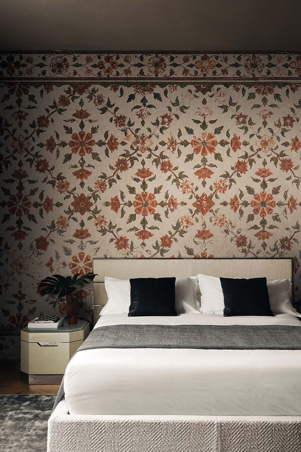 A path that emphasizes the eclecticism and universal nature of taste; an itinerary that crosses Europe, Asia, and Africa, leaving indelible traces in the graphics that can be seen within the collection. The search for extreme depth in the composition is able to develop over large surfaces by skilfully mixing blush, burnt, rusty tones, macro geometry, lace, tarot cards, and botanical elements. The result is an almost primordial elegance, reinterpreted through the colours of the earth with tribal accents, in which each subject is embellished and sophisticated. The graphics become a substantial element of the architectural project; a story to dress the environments and make them evocative.
