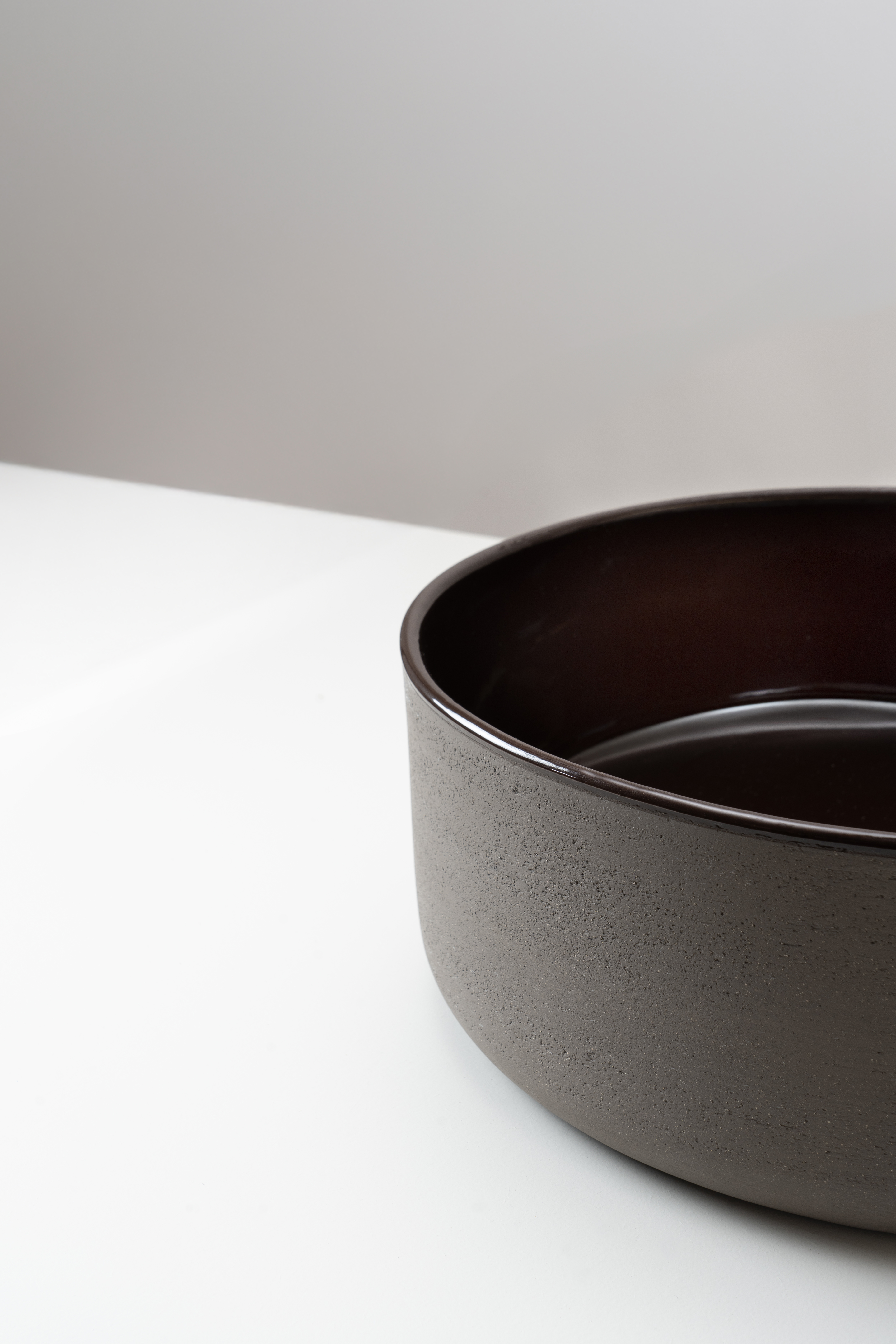 Countertop washbasin in natural earth or dark Raku. Simple and capacious shape. Available in various earths and finishes. A true abacus of emotions.