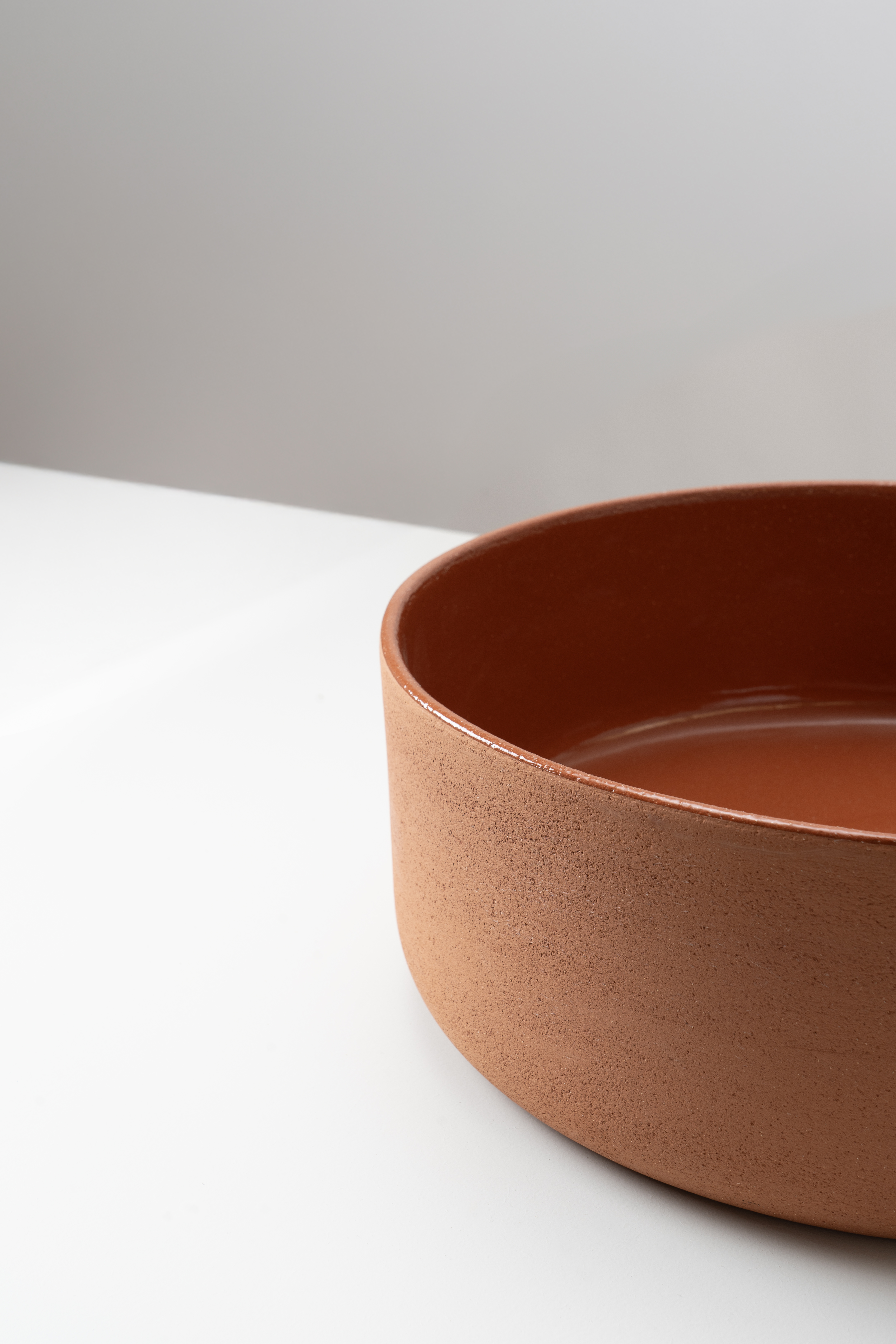 Countertop washbasin in natural earth or dark Raku. Simple and capacious shape. Available in various earths and finishes. A true abacus of emotions.