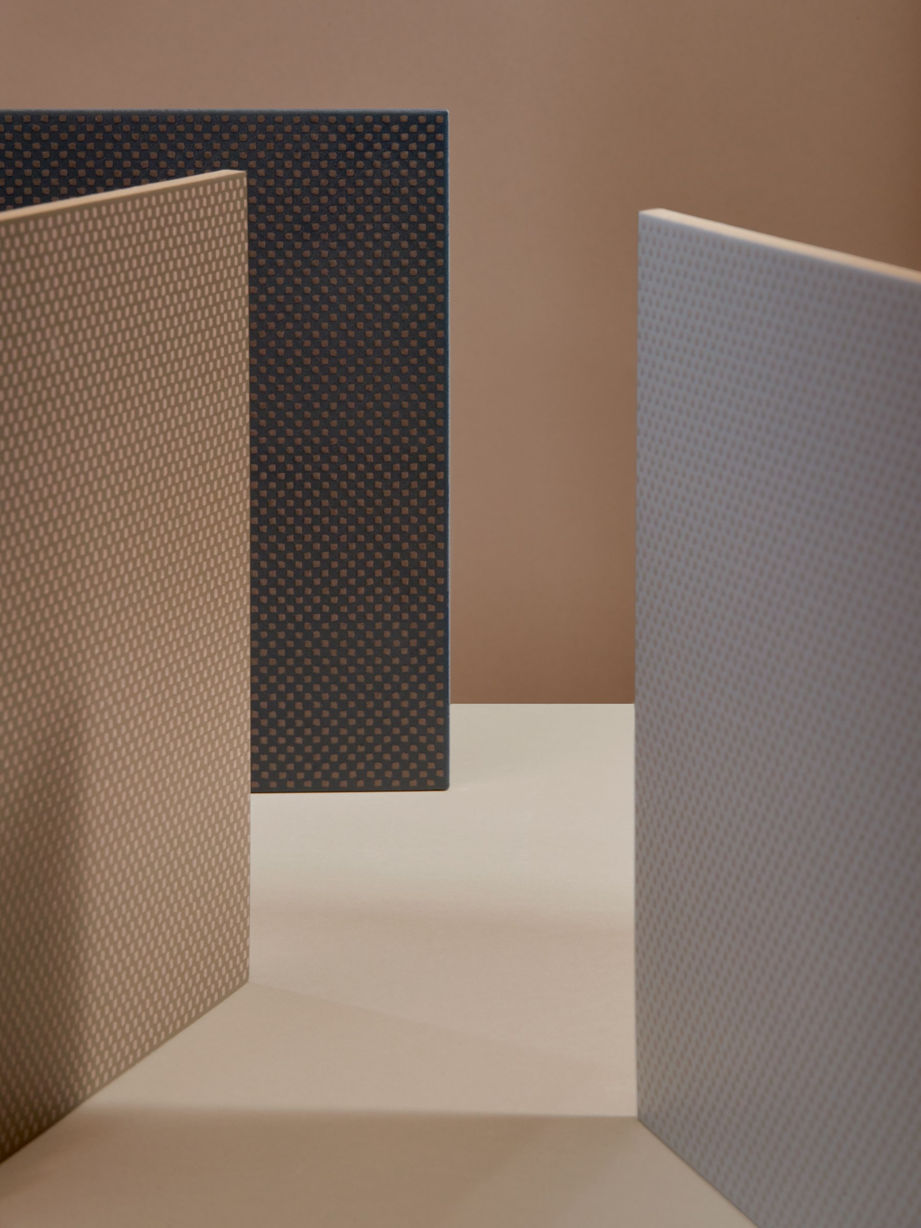The name comes from pincheck, the wellknown fine “chequered” pattern created with different coloured yarns. The motif is graphically reinterpreted to create a true weave consisting of imperfect strokes and movements. Pin is made of glazed porcelain stoneware in the 23.25x23.25 cm size and is designed to be combined with the bases, in 12 different colours, from the Colours range. Lively and colourful, the collection plays on perception; the 6 backgrounds are in fact superimposed on decorations in as many colours.