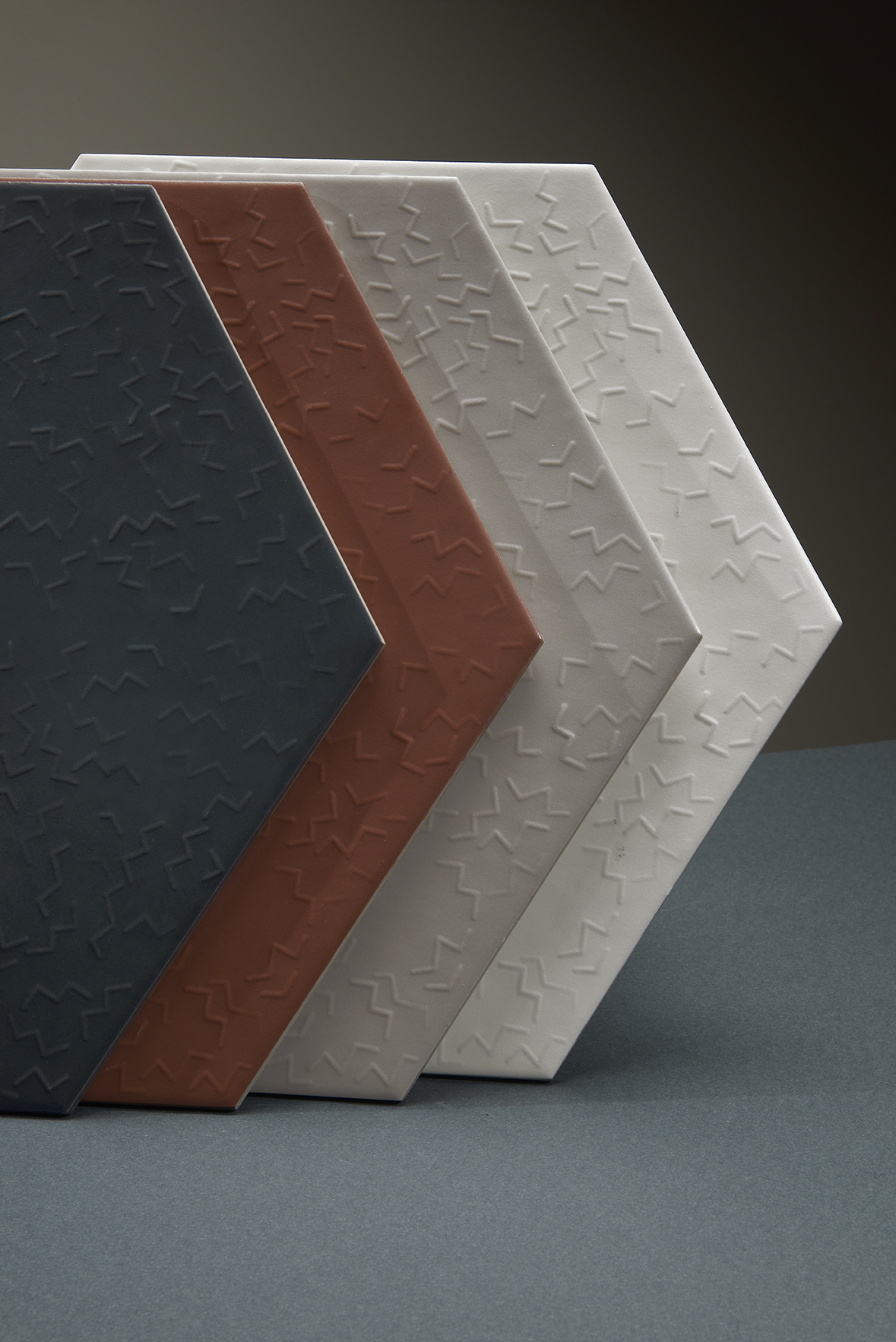 Rocket draws its inspiration from and pays tribute to compositional boldness, bright colours and the use of geometric shapes and textures designed to inspire optimism typical of the Memphis Group and of its post modernist exploration, far from the banality of aseptic design. Rocket is offered in materials and volumes with an iridescent visual meaning, defining rigorous and architectural environments and visual scenarios with explosive chromatic magnetism, where the graphic decoration emerges from the irregular materiality of the background, creating patches of rippled graphic backgrounds.